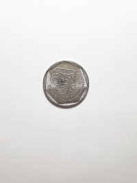 Moeda comemorativa dos 50 anos da FAO- Alimentos para o mundo. Aço Inoxidável 4,8gr 23,5mm. Foram produzidas 1.000.000 unidades.