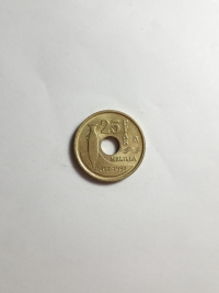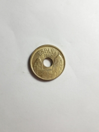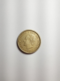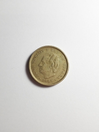 No anverso, retrato do ex-rei da Espanha, Juan Carlos I. No reverso, brasão de armas da Espanha. Bronze-Alumínio 9,25gr 24,5mm. Foram produzidas 125.674.000 unidades.