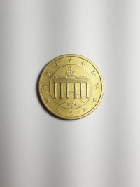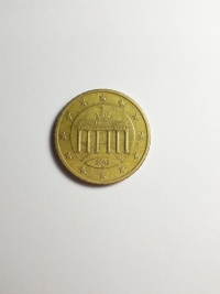 No anverso, o portão de Brandemburgo, símbolo da divisão da Alemanha e sua posterior unificação, cercado pelas 12 estrelas da Europa. Ouro nórdico 7,81gr 24,20mm. Foram produzidas 370.240.000 unidades.