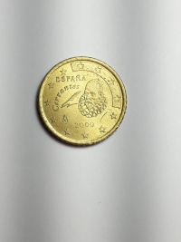 No anverso, retrato de Miguel de Cervantes, romancista dramaturgo e poeta castelhano, considerado o pai da literatura espanhola, rodeado pelas 12 estrelas da Europa. Ouro Nórdico 7,81gr 24,20mm. Foram produzidas 519.550.000 unidades.
