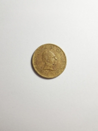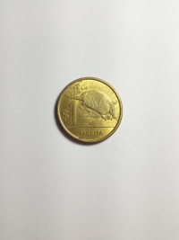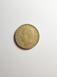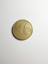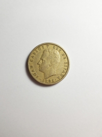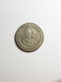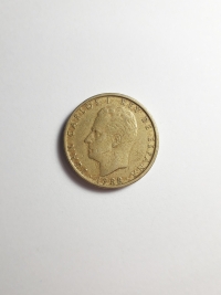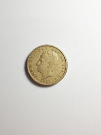 Comemorativa do Plano Numismático para a FAO. No anverso, retrato do ex-rei da Espanha, Juan Carlos I. Bronze-Alumínio 9,25gr 24,5mm. Foram produzidas 71.957.000 unidades.