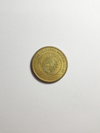 No anverso, retrato de José Artigas. Foi um político e militar uruguaio, sendo o herói nacional de seu país. Bronze-Alumínio 3,52gr 20mm. Foram produzidas 40.000.000 unidades.
